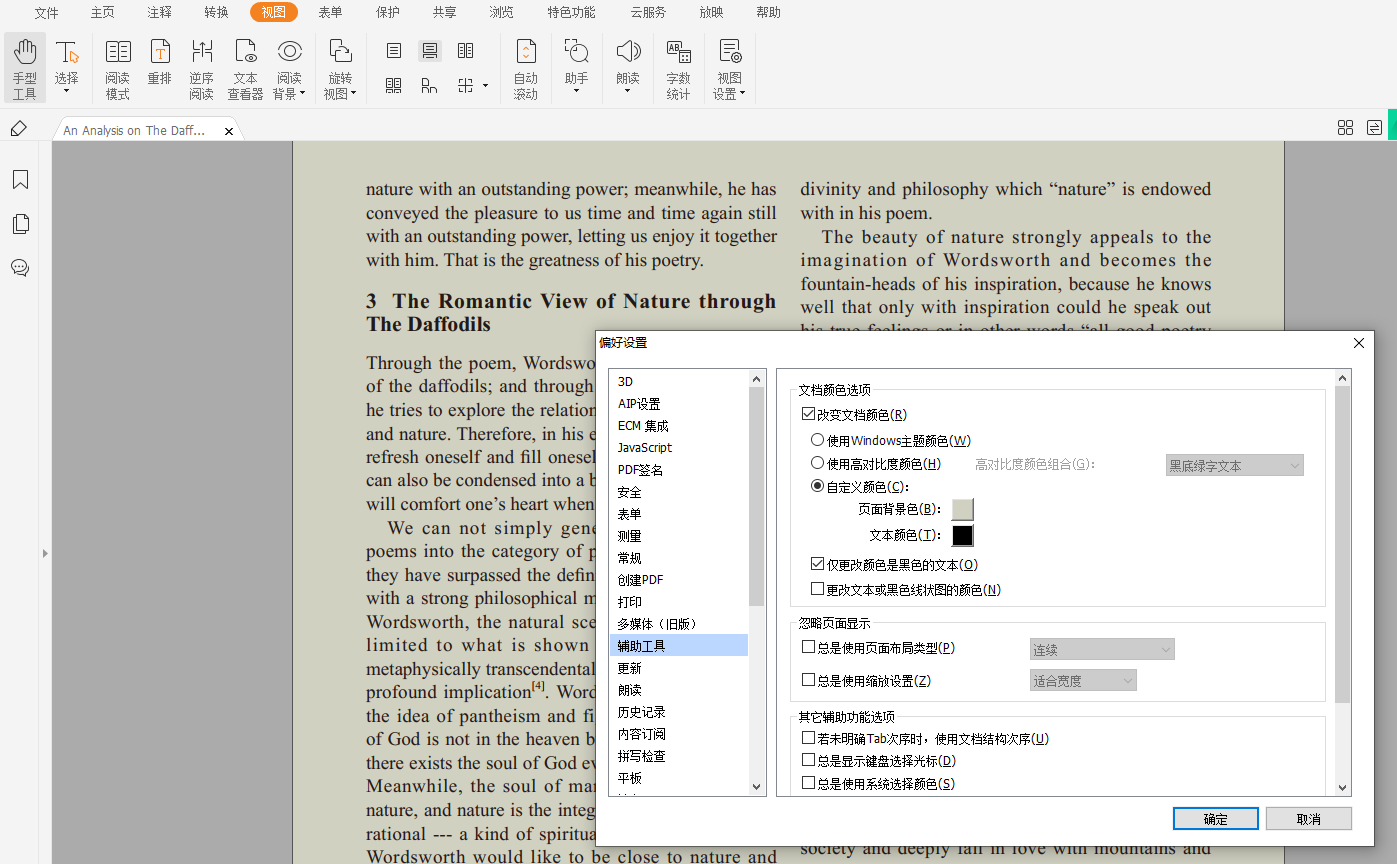 操作方法:文件—> 偏好设置—> 辅助工具—> 勾选改变文档颜色—> 即可自定义PDF的页面背景色和文本颜色