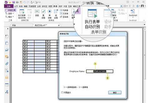 2、如果 PDF 表单包含交互式表单域,您则可以使用手型工具 直接填写表单。选择“表单” > “表单识别” > “执行表单自动识别”,